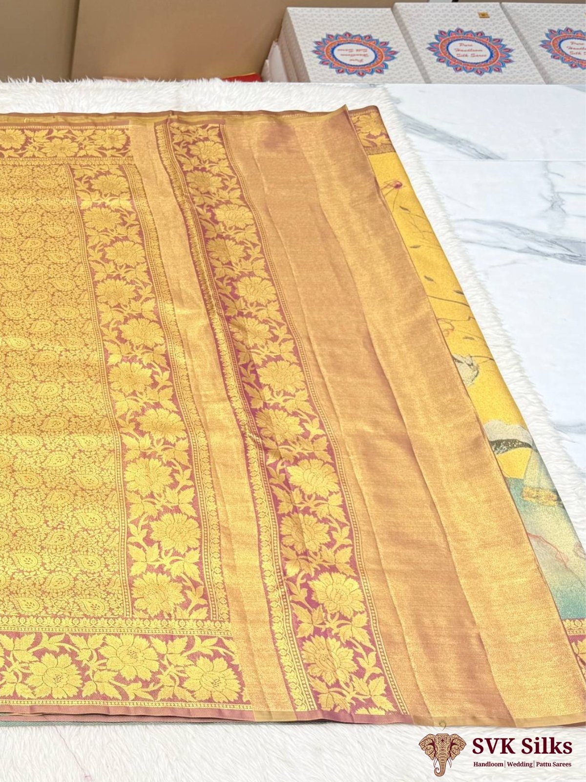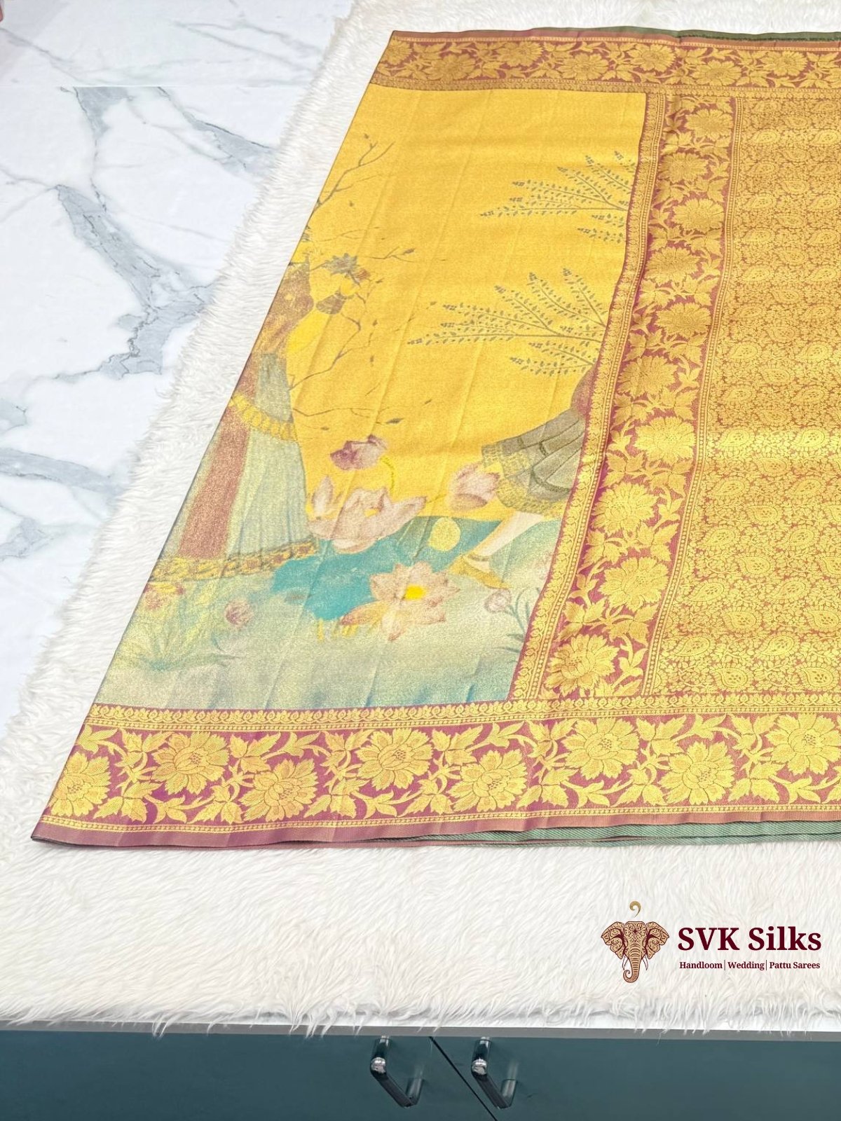Mustard Gold Digital Printed Silk Blend Saree with Pichwai Art Pallu and Banarasi Zari Border