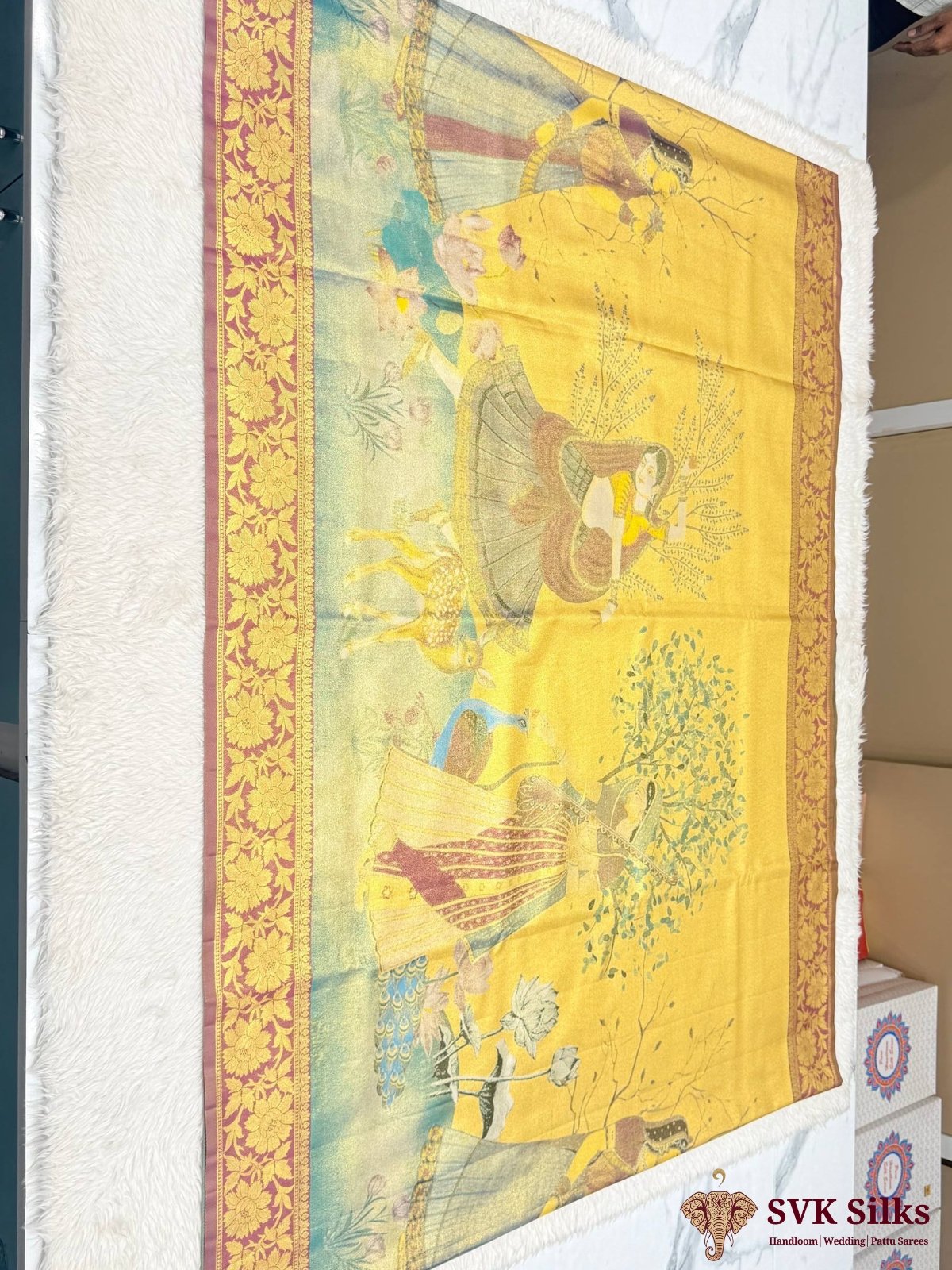 The saree features Radha-Krishna–inspired pastoral artwork (gopis, peacock, deer, lotus, trees) printed digitally on a rich mustard-gold base, paired with a maroon and antique gold floral zari border. It is a premium silk blend or art silk saree designed for festive and statement wear.